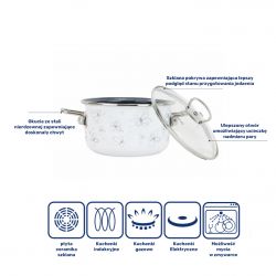 Elegancki garnek emaliowany z linii PREMIUM White to idealne połączenie klasycznego wzornictwa z nowoczesną funkcjonalnością. Wykonany z wysokiej jakości stali o grubości 2 mm i pokryty wyjątkowo trwałą emalią ETC (Easy To Clean), zapewnia zdrowe, energooszczędne i komfortowe gotowanie na co dzień. Kwiatowy motyw w odcieniach szarości i biała emalia zewnętrzna dodają mu ponadczasowej estetyki, która ozdobi każdą kuchnię. Idealny na prezent – pakowany w eleganckie pudełko.