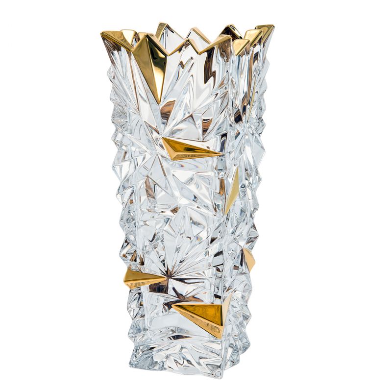 Wazon Bohemia Jihlava Gold Glacier o wysokości 30,5 cm to elegancki i luksusowy element dekoracyjny, który łączy w sobie tradycję czeskiego rzemiosła z nowoczesnym designem. Wykonany z wysokiej jakości szkła kryształowego (24% PbO) i zdobiony płynnym 96-karatowym złotem, zachwyca swoim artystycznym wyglądem i doskonałą przejrzystością.