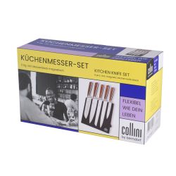 Stylowy i funkcjonalny zestaw noży kuchennych Collini by Berndorf to połączenie wysokiej jakości wykonania, eleganckiego designu i maksymalnej wygody podczas gotowania. Każdy nóż wykonany jest z wytrzymałej stali nierdzewnej, co zapewnia długą żywotność i ostrość, a rękojeść z drewna akacjowego gwarantuje komfort oraz stabilność w dłoni. Zestaw dopełnia nowoczesny magnetyczny blok, który nie tylko ułatwia przechowywanie, ale także wprowadza porządek i styl do każdej kuchni.