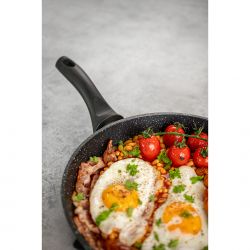 Ergonomiczny uchwyt pozostaje chłodny nawet podczas długiego smażenia, a jego kształt zapobiega ślizganiu się dłoni i ryzyku poparzeń. Brak nitów wewnątrz naczynia ułatwia mycie, a patelnia nadaje się również do mycia w zmywarce. Nowoczesny design z granitowym wykończeniem sprawia, że patelnia REMOSKA EUROPA doskonale wpisze się w każdą kuchnię.