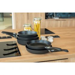 Solidny aluminiowy korpus o grubości 4,5 mm zapewnia równomierne rozprowadzanie ciepła na całej powierzchni patelni, co przekłada się na energooszczędne i efektywne gotowanie. Patelnia doskonale wykorzystuje również ciepło resztkowe, dłużej utrzymując temperaturę potraw.