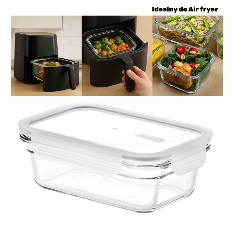 Szklany pojemnik prostokątny z plastikową pokrywką z zatrzaskami oraz białą uszczelką został wykonany z wysokiej jakości szkła hartowanego. Specjalna silikonowa uszczelka zapewnia całkowitą hermetyczność i zatrzymuje zapach żywności wewnątrz pojemnika. Ograniczona ilość tlenu w zamkniętym pojemniku sprawia, że przetrzymywany produkt o wiele dłużej zachowuje świeżość. Szklany pojemnik służy przede wszystkim do przechowywania żywności (pojemniki są zaprojektowane w taki sposób, aby pasowały do każdej kuchni i umożliwiały lepsze jej zorganizowanie - puste pojemniki można przechowywać jeden w drugim, a pełne układać na sobie) lub jako lunchbox, który można zabrać do pracy - dzięki uszczelce, zupa czy sos nie wyleje się, np. podczas niesienia w torebce lub przewożenia. Szklany pojemnik jest przyjazny dla środowiska (podlega recyklingowi) oraz dla użytkowników (nie zawierają Bisfenolu A - BPA i estrogenów).
