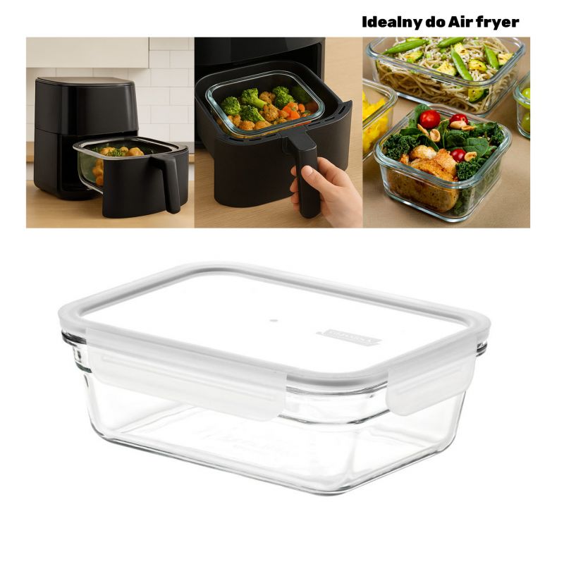 Szklany pojemnik prostokątny z plastikową pokrywką z zatrzaskami oraz białą uszczelką został wykonany z wysokiej jakości szkła hartowanego. Specjalna silikonowa uszczelka zapewnia całkowitą hermetyczność i zatrzymuje zapach żywności wewnątrz pojemnika. Ograniczona ilość tlenu w zamkniętym pojemniku sprawia, że przetrzymywany produkt o wiele dłużej zachowuje świeżość. Szklany pojemnik służy przede wszystkim do przechowywania żywności (pojemniki są zaprojektowane w taki sposób, aby pasowały do każdej kuchni i umożliwiały lepsze jej zorganizowanie - puste pojemniki można przechowywać jeden w drugim, a pełne układać na sobie) lub jako lunchbox, który można zabrać do pracy - dzięki uszczelce, zupa czy sos nie wyleje się, np. podczas niesienia w torebce lub przewożenia. Szklany pojemnik jest przyjazny dla środowiska (podlega recyklingowi) oraz dla użytkowników (nie zawierają Bisfenolu A - BPA i estrogenów).