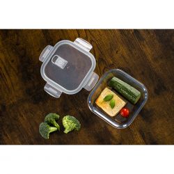 Wykonany z wysokiej jakości szkła żaroodpornego, pojemnik jest odporny na wysokie i niskie temperatury. Możesz bez obaw używać go w mikrofalówce, piekarniku (bez pokrywki), lodówce, zamrażarce, a nawet air fryerze.