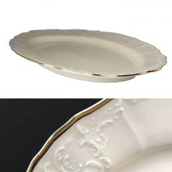 Elegancki półmisek owalny Bernadotte o wymiarze 26 cm to połączenie wysokiej jakości białej porcelany z wyjątkowym wzorem koronki oraz subtelną, złotą obwódką. Dzięki unikalnemu, wypukłemu zdobieniu oraz klasycznemu designowi, półmisek doskonale sprawdzi się zarówno na co dzień, jak i podczas wyjątkowych okazji, dodając stołowi szlachetnego charakteru.