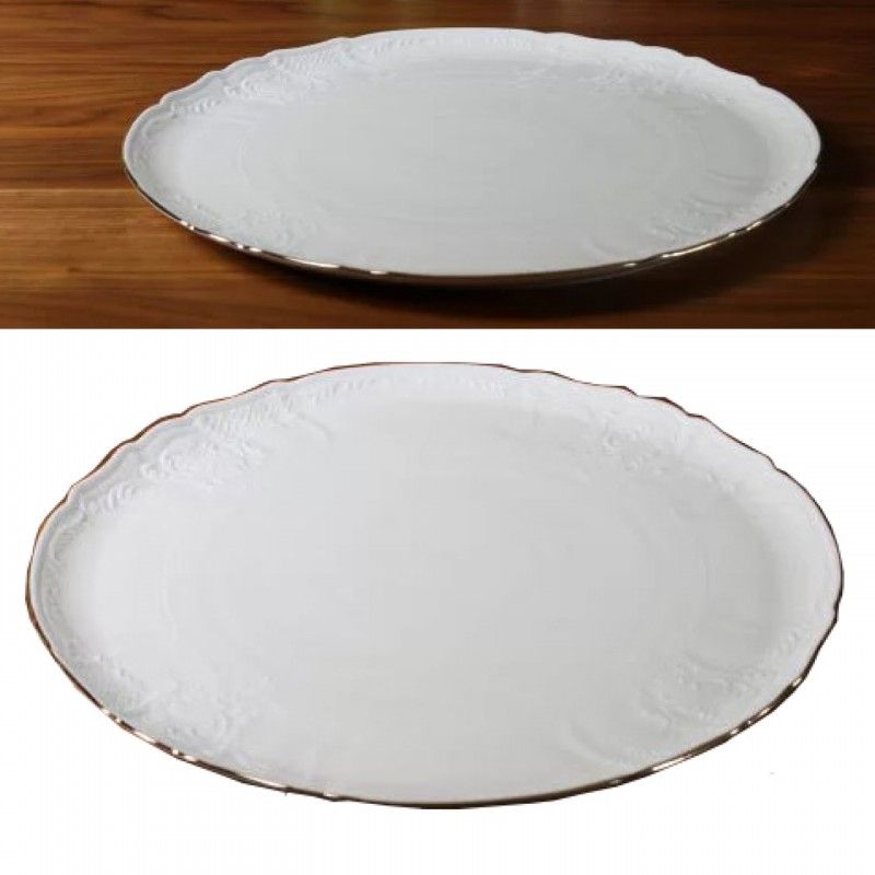 Elegancki półmisek na ciasto z kolekcji Bernadotte to doskonały wybór dla miłośników klasycznego stylu i wyrafinowanego designu. Wykonana z wysokiej jakości białej porcelany, zachwyca subtelnym reliefowym wzorem przypominającym koronkę, który nadaje jej niepowtarzalny charakter. Złoty rant podkreśla jej wyjątkowy wygląd, dodając nuty luksusu każdemu nakryciu stołu.