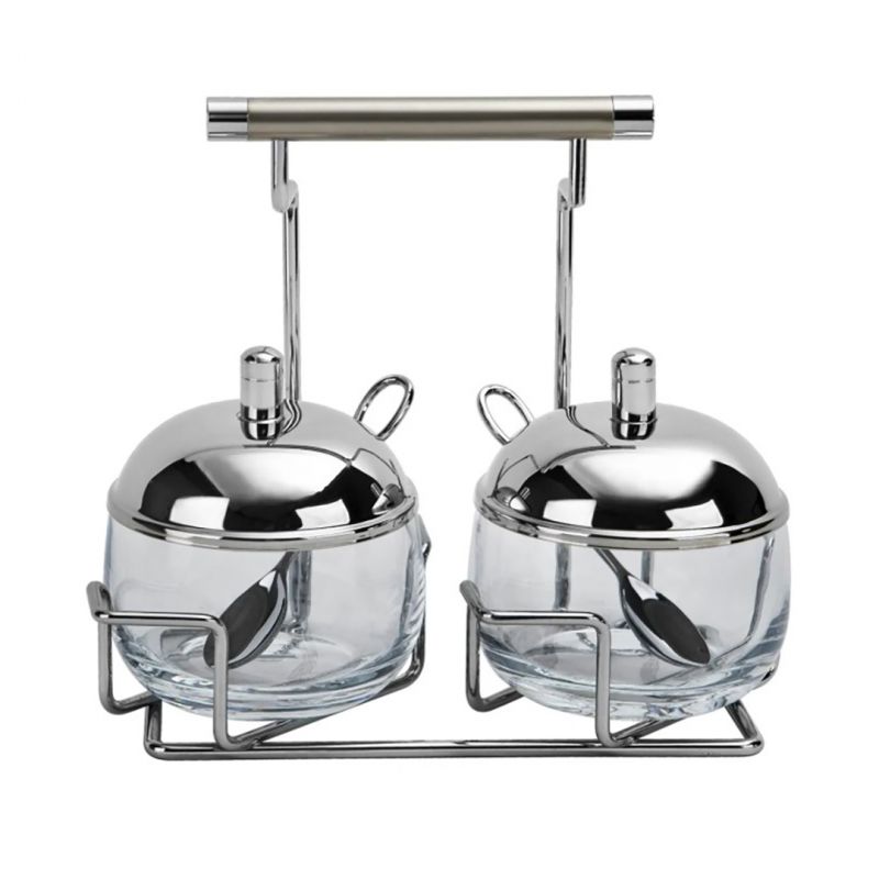 Regent Cukiernica Podwójna Perle to elegancki i funkcjonalny zestaw, który doda klasy każdemu stołowi. Wykonana z wysokiej jakości polerowanej stali nierdzewnej 18/10 oraz szkła, doskonale sprawdzi się zarówno podczas rodzinnych uroczystości, jak i codziennych posiłków. Umieszczona na metalowym stojaku z dwoma łyżeczkami, jest idealnym rozwiązaniem do serwowania cukru, konfitur czy przetworów. Świetnie pasuje nie tylko do domowej jadalni, ale także do restauracji, kawiarni czy barów.