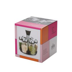 Stojak zawiera 6 szklanych pojemników z pokrywkami ze stali nierdzewnej, wyposażonymi w praktyczne trójstopniowe dozowanie – od drobnego posypywania, przez grubsze, aż po pełne otwarcie. Dzięki temu dopasujesz sposób użycia przypraw do przygotowywanych potraw.