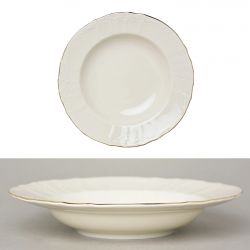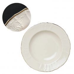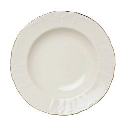 Talerz głęboki z kolekcji BERNADOTTE Ivory Gold to elegancja i wyrafinowanie w klasycznym wydaniu. Wykonany z wysokiej jakości porcelany, zachwyca subtelnym odcieniem kości słoniowej, uzupełnionym o szlachetne złote zdobienia. Idealny do serwowania zup, kremów lub dań jednogarnkowych – stanie się ozdobą każdego stołu.